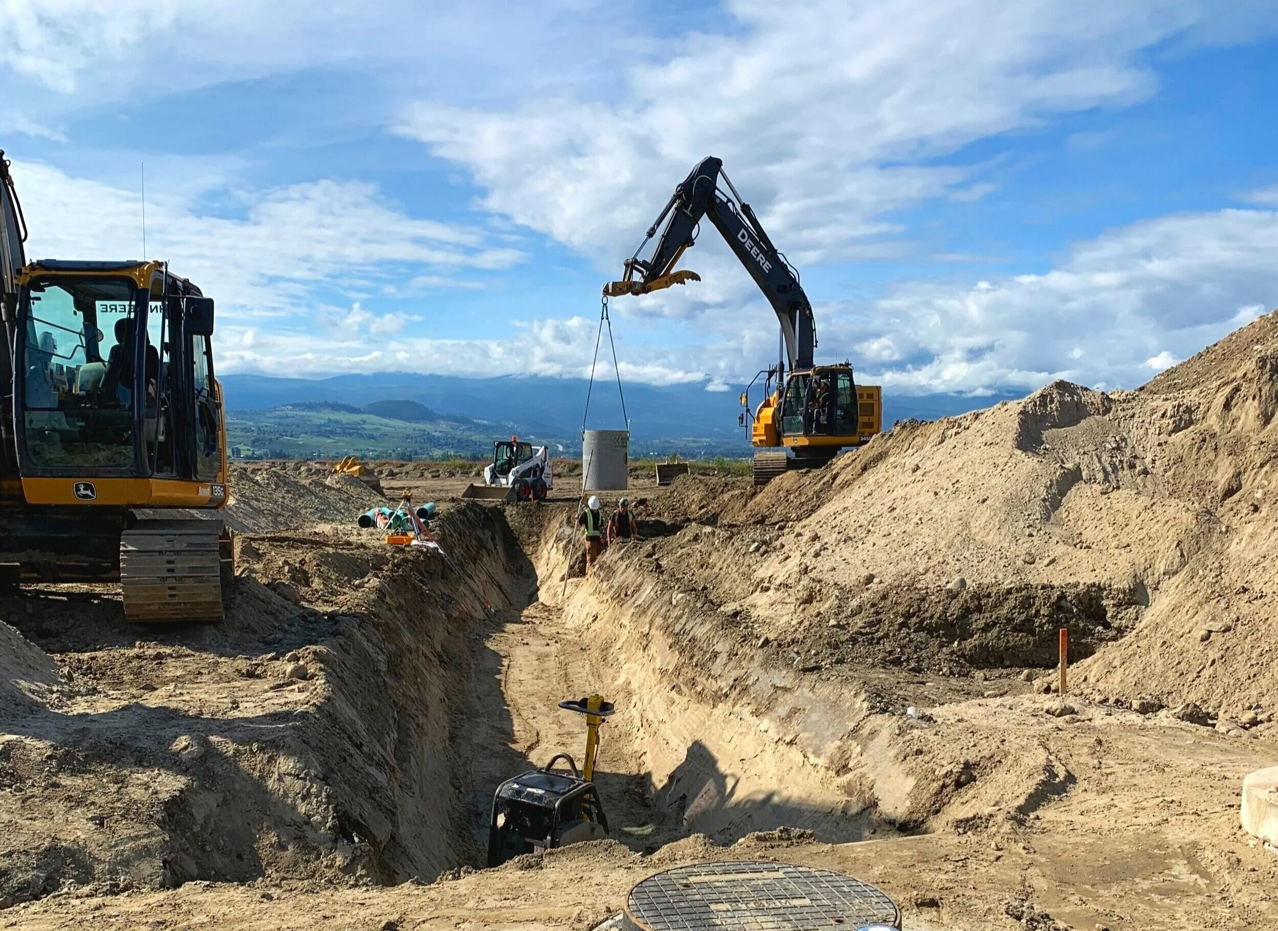 Excavating and earthworks. Water main installation and sewer installation. Onsite and access road building.